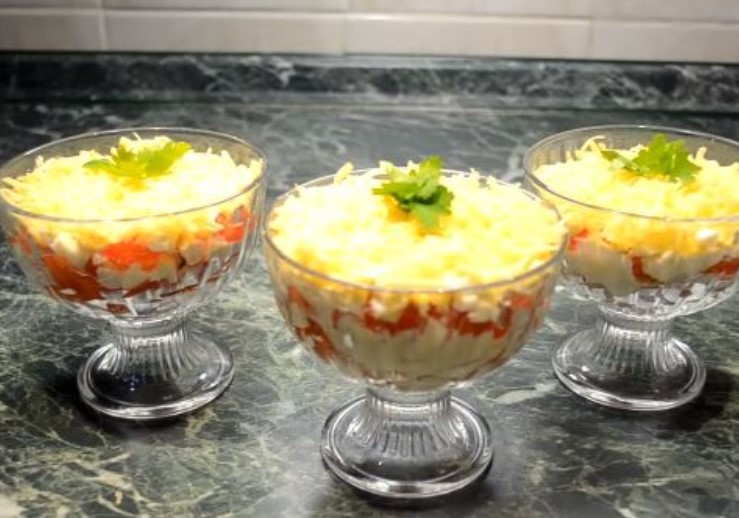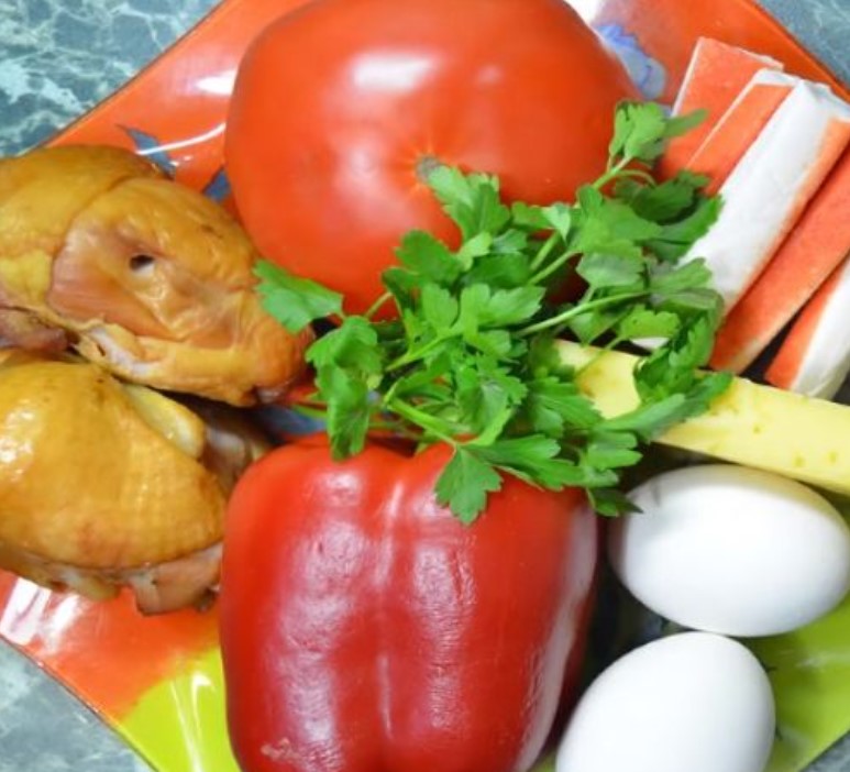 Put the prepared products in a salad bowl (or portioned transparent glasses / bowls) in layers, smearing each layer with mayonnaise, in the following sequence: smoked chicken, bell peppers, crab sticks, tomato, eggs and cheese.