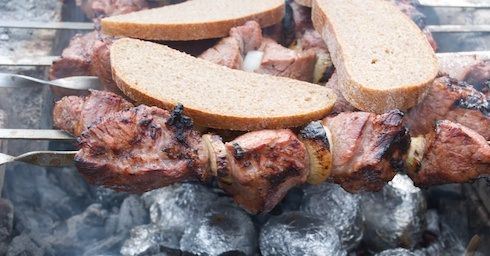 We cook kebab for about 15-20 minutes, on coals. Very tasty bread is soaked with the marinade and the smell of meat, which is put on a kebab when it is a little fried.