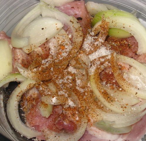 Cut the onion into half rings, add to the meat along with salt and spices.