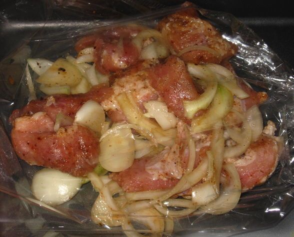 Fasten the sleeve on the other side. Make a few small holes on the top of the sleeve to let the steam out. And send the shish kebab in the sleeve to the oven for an hour.