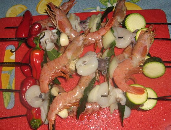 We string shrimp and cuttlefish on skewers, alternating with vegetables and bay leaves.