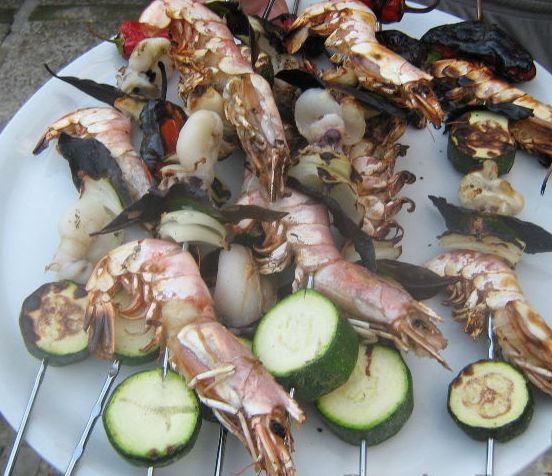 Excellent shrimp and cuttlefish kebabs, as well as fish: grilled flounder and dorado. What could be easier? On summer days, seafood kebabs are just what you need! And men are in business, and we do not need to stand at the stove!