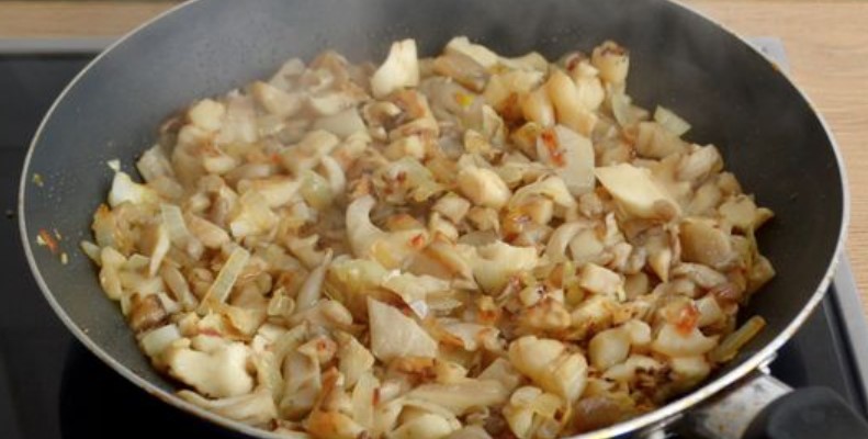 Add the mushrooms to the onion in a skillet and stir. Fry the mushrooms, stirring occasionally, over medium heat for about 8-10 minutes.