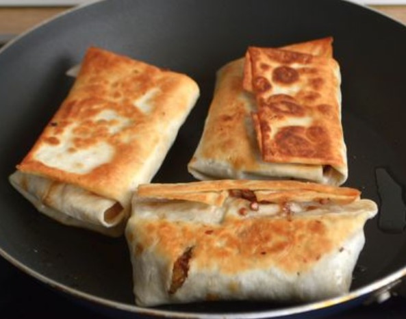 Place pita bread envelopes filled with a frying pan on a plate lined with a paper napkin to absorb excess oil.
