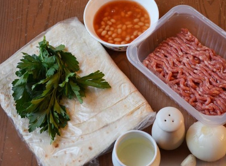 A variant of a simple but tasty and hearty lunch or dinner is pita bread with minced meat, fried with onions and garlic, and canned beans.