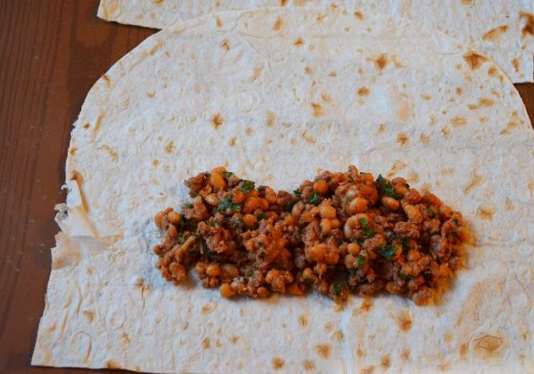 Roll up pita bread with minced meat and beans in an envelope, tucking the edges.