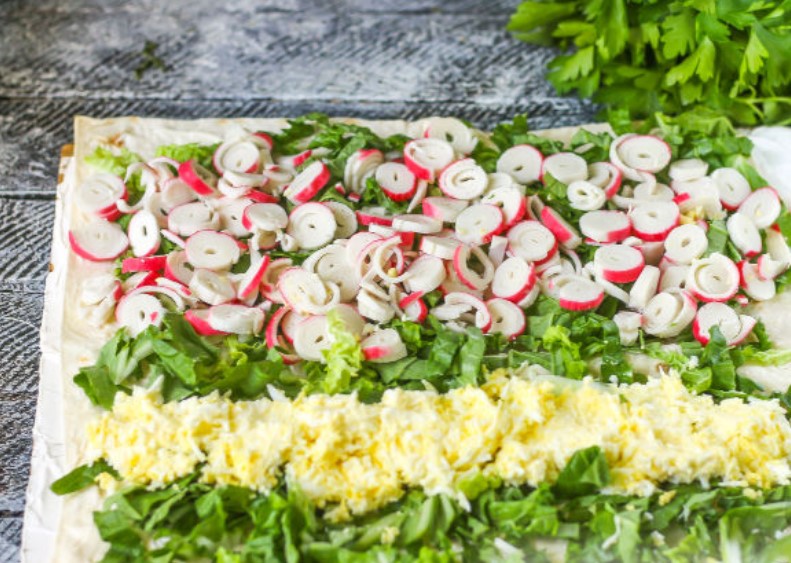 The recipe for lavash roll with crab sticks, Chinese cabbage and eggs will allow you to quickly and easily prepare an excellent appetizer – juicy and colorful.