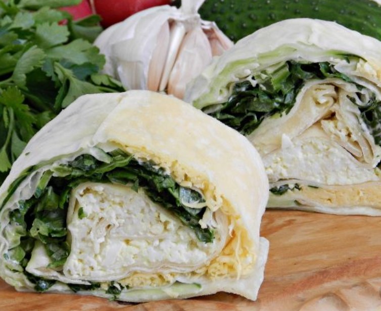 Wrap a lavash roll with cucumbers, eggs and cheese in plastic wrap and refrigerate for 1 hour.