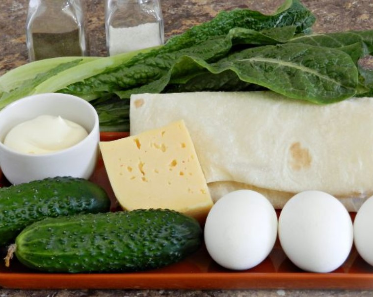 Lavash roll with a light filling of lettuce leaves, fresh cucumbers, eggs and cheese is a versatile dish that is suitable both for a festive table and for a picnic or a regular breakfast.