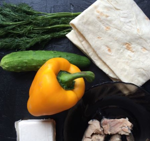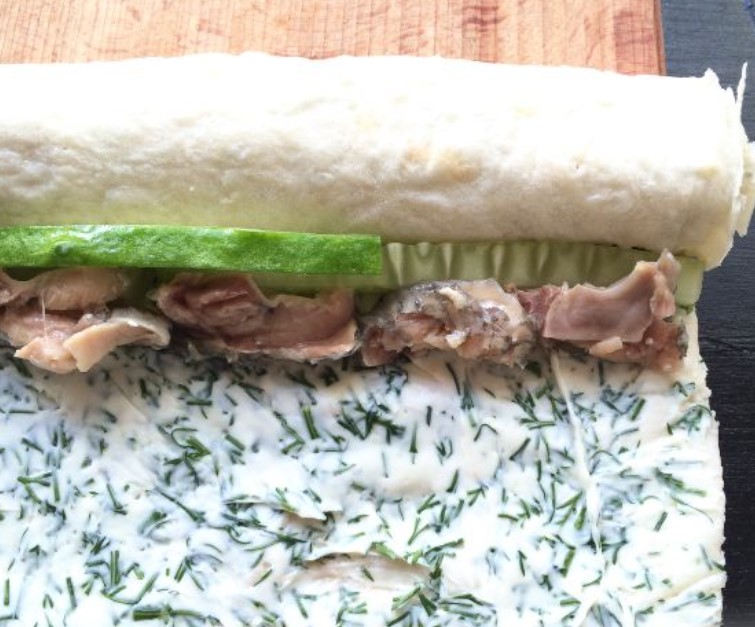 Repeat this sequence until the pita bread is completely wrapped. The resulting lavash roll with pink salmon must be put in the refrigerator for an hour so that it is soaked.
