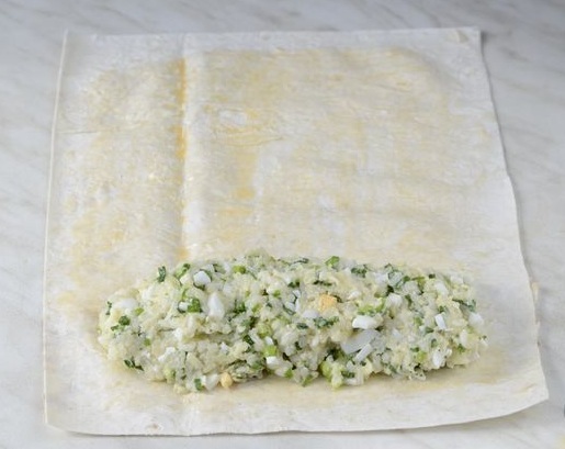 Stepping back a couple of centimeters from the edge of the pita bread, layout the filling of rice, eggs, cheese, and herbs.