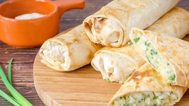 Lavash stuffed with rice, boiled eggs, cheese, and green onions is an easy-to-prepare, tasty, and satisfying dish. You can take such a pita roll for a picnic or simply diversify your daily menu.