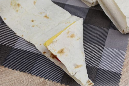 Holding the filling, connect the corner of the pita bread with the opposite side of the strip. In this case, a triangle is formed, under which the filling is hidden.