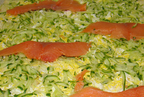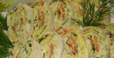 An easy way to prepare a delicious and light snack is to wrap a filling of red fish, boiled eggs, fresh cucumbers, and cheese in thin pita bread.