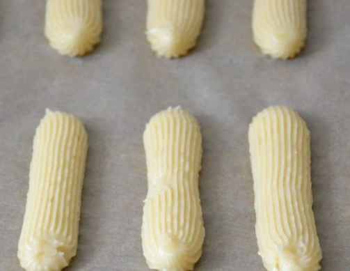 Transfer the dough to a pastry bag and place on a baking sheet at a distance, the standard length of the eclair is 13 centimeters.