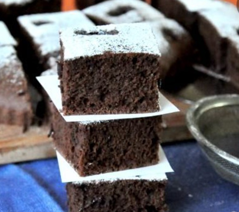 Check the cupcake while baking to make sure the bottom isn’t burning. If necessary, lower the temperature to increase the baking time. We take out the finished cake and cut it into pieces. I decided to sprinkle them with powdered sugar on top. This will emphasize both taste and color. I’ll serve hot tea to them.