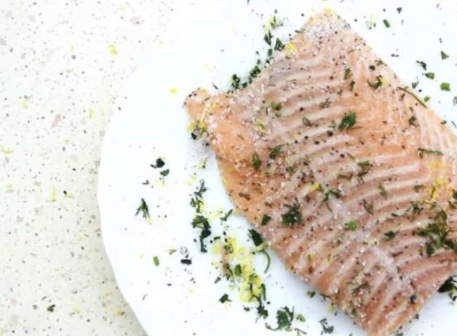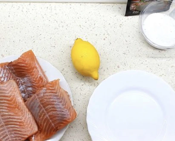 Sprinkle a flat plate with salt, pepper, and finely grated lemon zest. Lemon zest is needed to prevent the fish from breaking down into fibers, as well as for a bright refreshing aroma and taste.