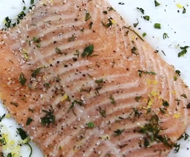 Put salmon fillets 1 cm thick on a plate, sprinkle with the above spices again, adding chopped dill (do not replace with other herbs). We leave it in the refrigerator for 1.5 hours, covered with cling film.