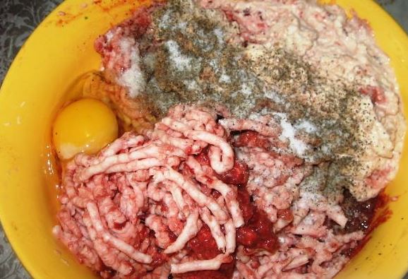 Skip meat, liver, bacon, soaked bread, and onion through a meat grinder. Add egg, salt, and spices. Mix well.
