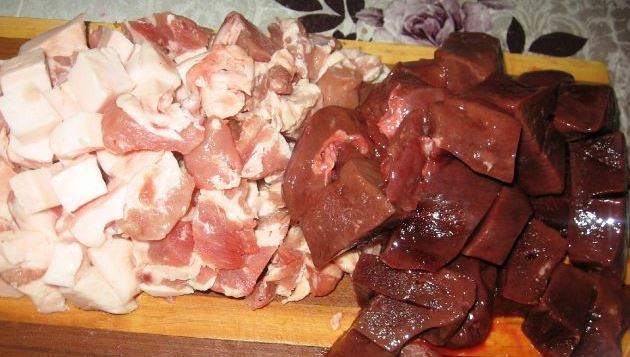 Cut the meat, bacon, and liver into small pieces.