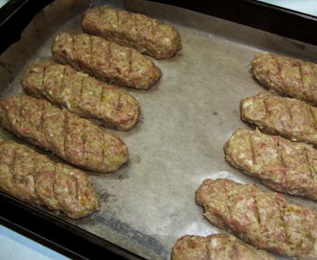 Take a serving of minced meat, shape it into a sausage and place on a baking sheet. Make oblique cuts on the top of the sausage, for beauty.lo