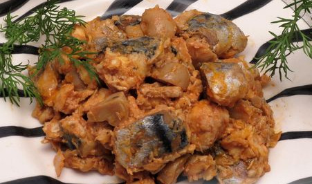 Put the mackerel in the sauce, stir gently, reduce the heat, cover and simmer until the fish is ready? 20-25 minutes.