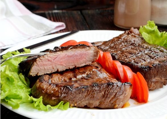 Marinated steak with soy sauce, garlic, and honey is ready. Rinse and dry the tomato and lettuce. Cut the tomato into thin slices. Place the steaks on a plate of lettuce and garnish with chopped tomato.