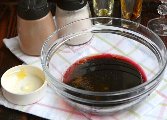 Prepare the marinade. To do this, combine wine vinegar, soy sauce, honey, and olive oil in a deep bowl.