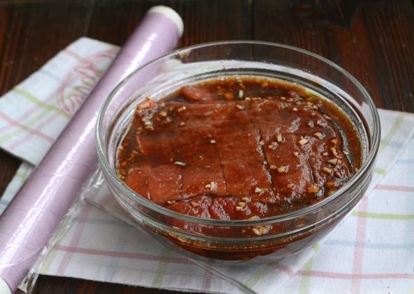 Add garlic to the marinade. Place the portions of beef in the marinade. Cover the bowl with cling film and refrigerate for 2-8 hours.