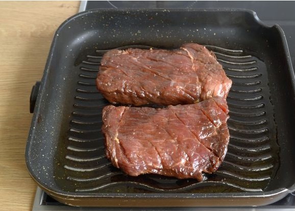 Turn the meat over to the other side and cook for another 3 minutes. In this case, the medium degree of roasting is Medium. If you want bloody meat, shorten the frying time.
