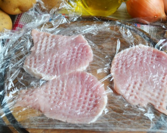 Cover the pork with cling film and beat carefully.