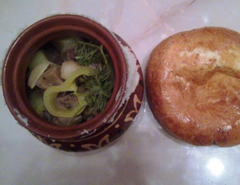 Half an hour after we put the pots in the oven, we take them out. Remove the lids and cover with pancakes from the dough we made. We put back in the oven for another 30 minutes.