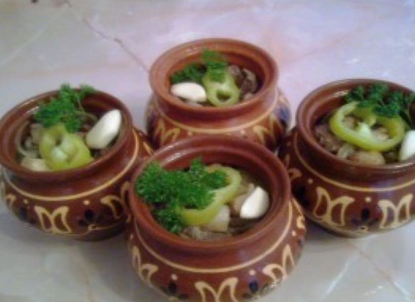 We put food in pots. First, meat with onions and mushrooms, then potatoes and carrots. Put a ring of pepper, garlic on top. Salt, add ground pepper. If, when frying meat, there is not enough broth, add half a glass of water to each pot. We close the pots with lids and put in the oven for 30 minutes. We cook at a temperature of 200 degrees.