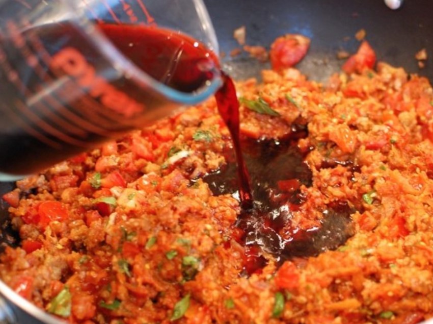 Pour wine into the sauce and stir.