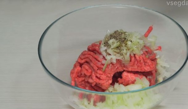 Add half of finely chopped onion, salt, pepper to the minced meat and mix well.