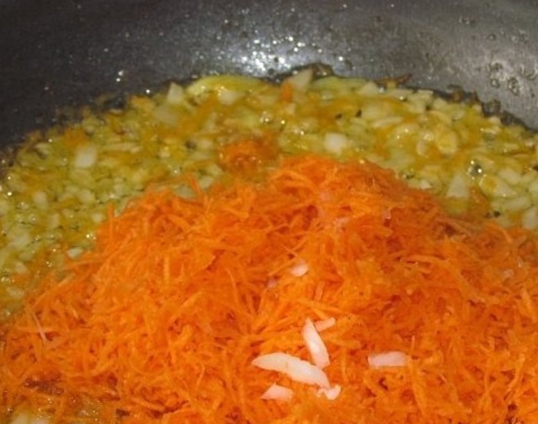 Finely chop the onion, and three carrots on a coarse grater. Heat the vegetable oil in a frying pan and fry the onion in it first, and then add the carrots. Fry until vegetables are tender.