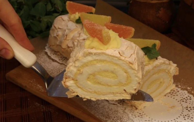 And here is such a meringue roll with lemon cream in a cut.