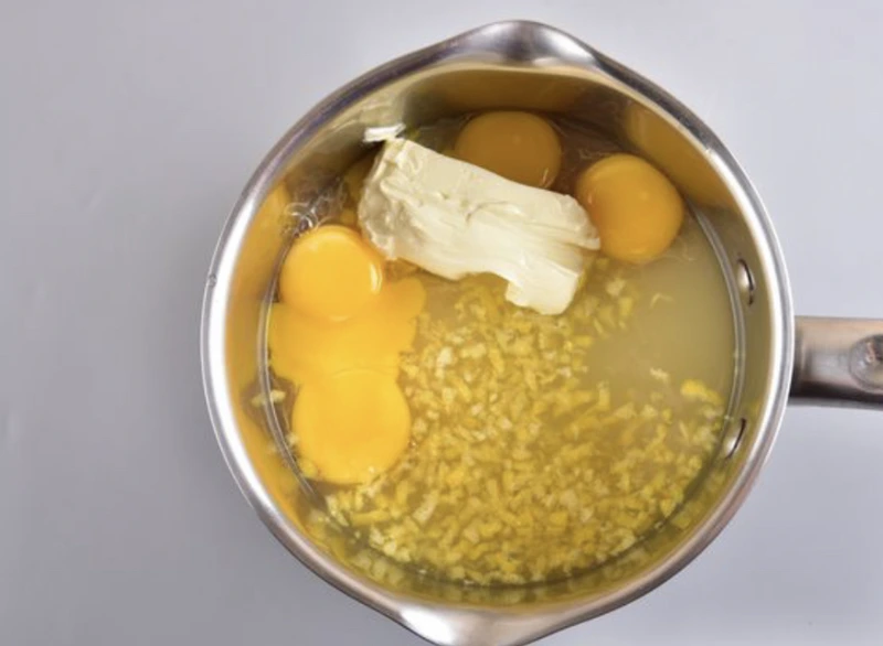Send yolks and sugar to a saucepan or stewpan. Add lemon juice, zest and soft butter.