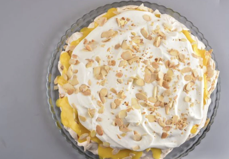 Put the meringue cake on a dish, gently apply lemon cream on top.