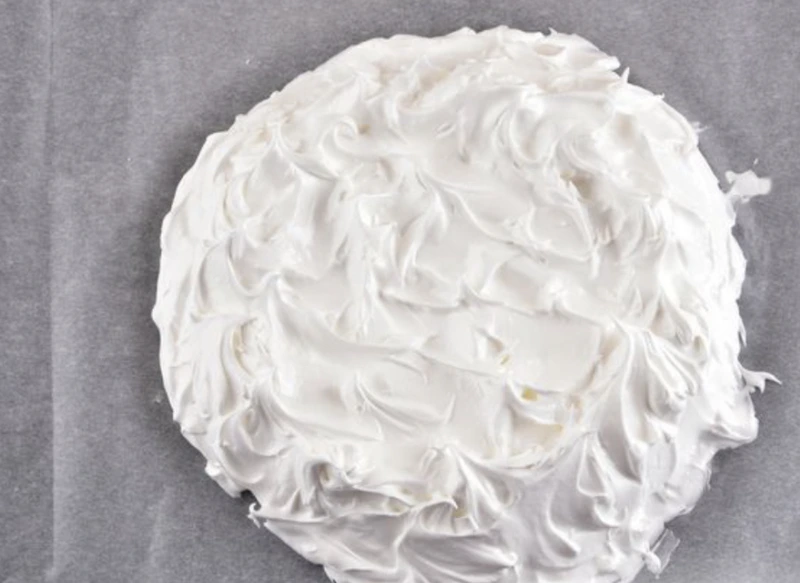 Secure the parchment to the baking sheet. Distribute the meringue, forming a circle with a diameter of 21-23 cm. Place the baking sheet in a preheated oven and immediately reduce the temperature to 130 degrees. Bake the meringue for 1.5 hours. Then turn off the oven, open the door slightly and leave the meringue to cool completely, for 2-3 hours.