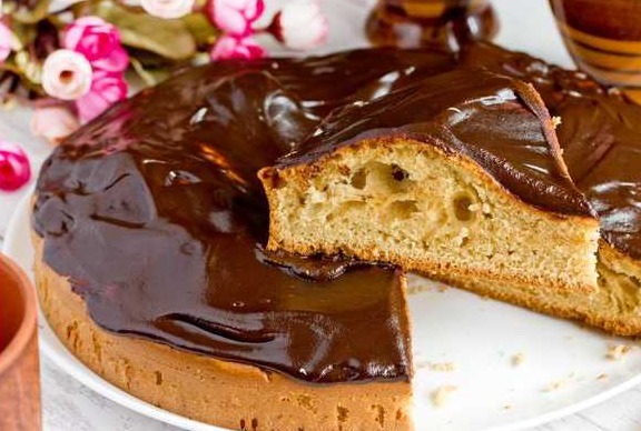 Milk pie with chocolate icing is ready. Cut the pie into portions and serve with dessert.