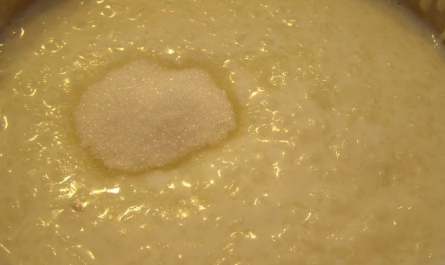 Before serving, milk rice porridge is seasoned with butter. You can season the porridge with whipped yolk (optional).