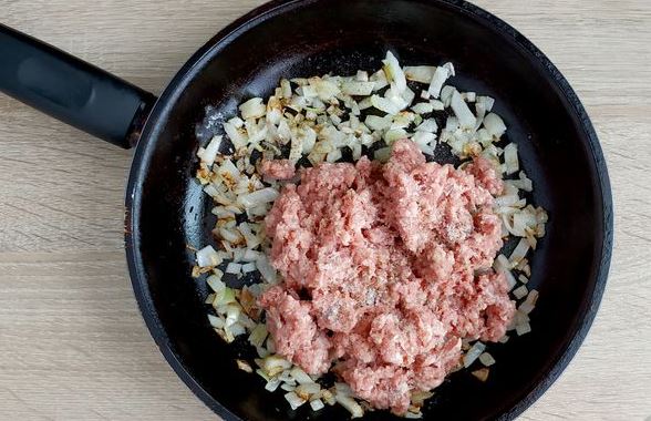 Add minced meat to the pan to the onion (I have beef). Season with salt and pepper. Fry the minced meat over high heat, stirring occasionally, until the color changes.
