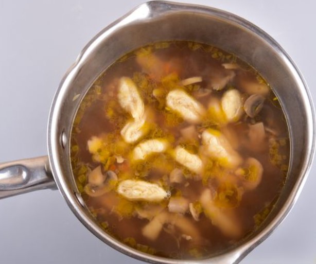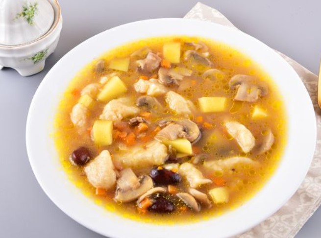 Add dumplings to the soup and cook for another 4-5 minutes over low heat. Let the prepared mushroom soup with beans and garlic dumplings stand for 5 minutes.