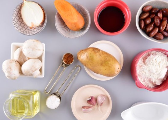 Pour the mushrooms and carrots with water. Add potatoes, beans, salt and black pepper. Bring the contents of the saucepan to a boil and cook over low heat for 15 minutes.