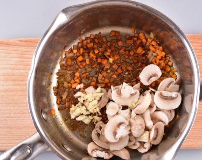 Then add mushrooms and 2/3 garlic. Fry over low heat for another 5 minutes.