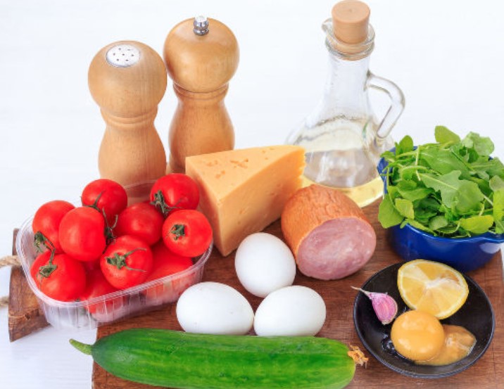 The “Mushrooms” appetizer of eggs, cheese, ham and cherry tomatoes is ready. Serve the dish to the table.
