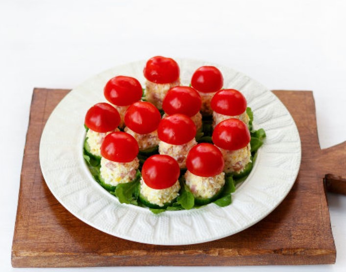 Bright, appetizing and incredibly delicate in taste “Mushrooms” appetizer made of eggs, cheese, ham and cherry tomatoes is a spectacular and unpretentious dish in preparation, which diversifies the festive menu and will decorate any feast.