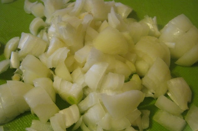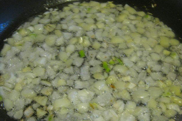 Preheat a frying pan, pour in vegetable oil. Put prepared onion into hot oil. Simmer over medium heat, stirring occasionally, for 2-4 minutes, until the onion is golden.