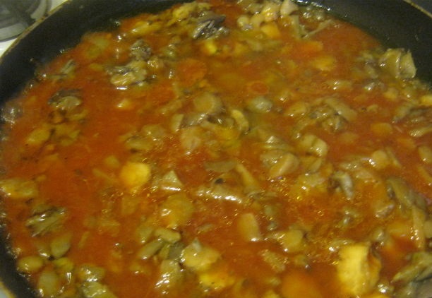 Pour tomato juice over the mushrooms. Simmer mushrooms in tomato sauce over low heat for 5 minutes.